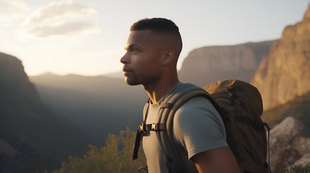 Handsome african american man hiking in the mountains at sunset