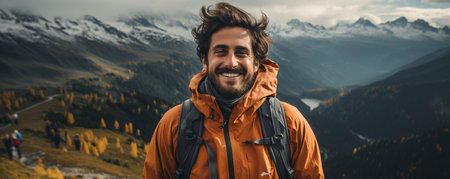 Happy male hiker in a warm yellow jacket smiling outdoors with mountains in the background
