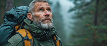 Gazing above, a senior traveller wearing a green jacket and a grey beard studies a dense, misty forest as sunlight streams through the trees.