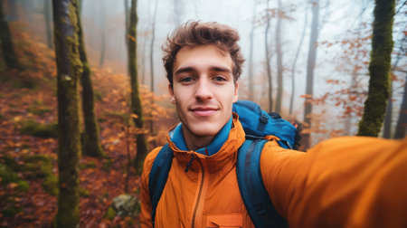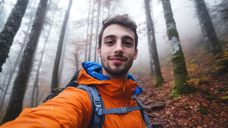 A young man captures a hiking selfie amidst tall trees in a misty forest. The scene is filled with autumn leaves, creating a serene and vibrant atmosphere during his outdoor adventure.