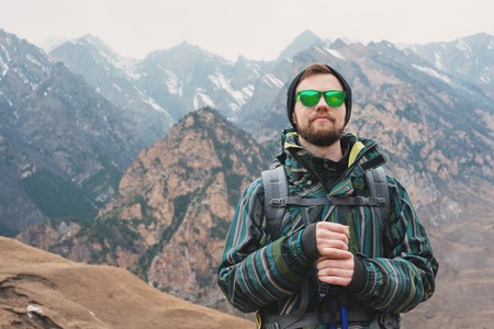 A guy with a beard and wearing sunglasses in a membrane jacket, hat, with a backpack and sticks for Nordic walking, a traveler standing and looking at the mountains
