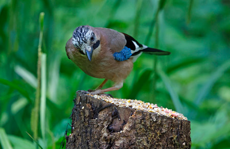 Eurasian Jay standing and eating on a stump