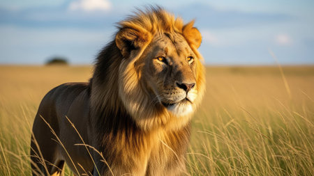 Majestic male lion in savannah at sunset, symbolizing the king of the wild in its natural habitat