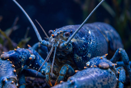 This stunning close-up image of a blue lobster captures the intricate textures and vibrant colors of this unique sea creature against a dark background.
