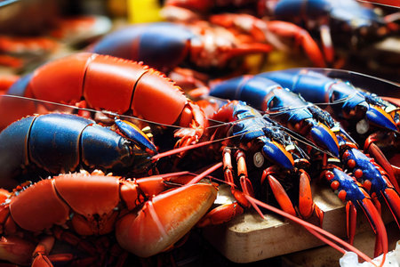 An eye-catching display of a vibrant blue and red lobster, illustrating the beauty of marine life and its culinary significance in coastal cuisine.