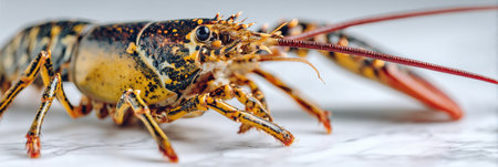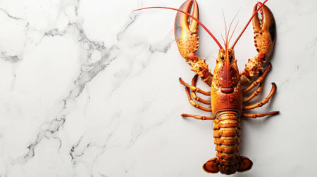 Close-up of a lobster on white marble, showing its vibrant colors, perfect for seafood lovers and culinary photography.