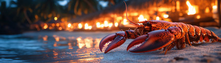 Lobsters dancing on sand under tiki torches