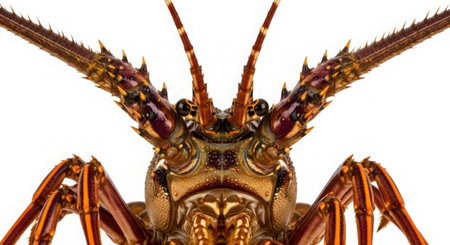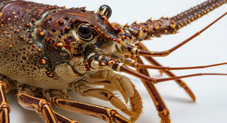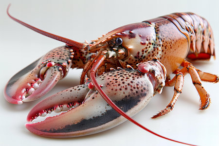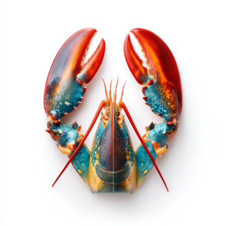 High-resolution image of a single lobster, showcasing detailed texture and colors, shot from above on a white backdrop.