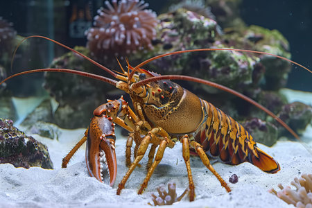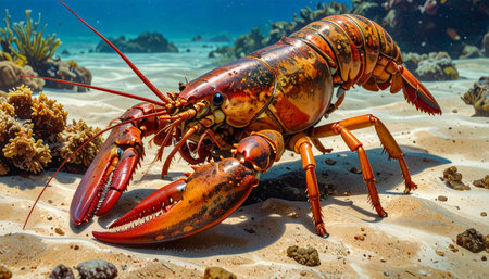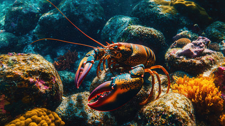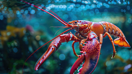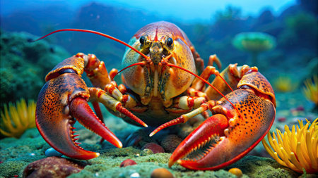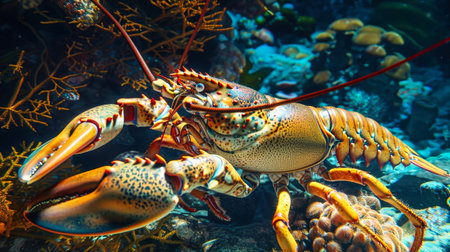 A stunning close-up image of a lobster intricately detailed against a backdrop of colorful marine plants, capturing the beauty of ocean life and exploration.