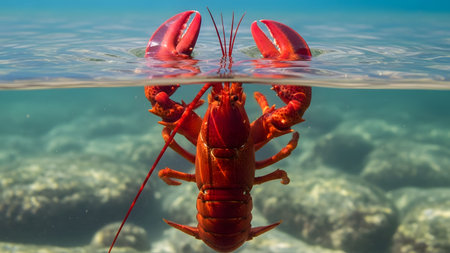 A bright red lobster swimming just below the surface of a clear blue sea. The crustacean's claws are raised, and its reflection is visible on the water's surface, with a rocky seabed below.