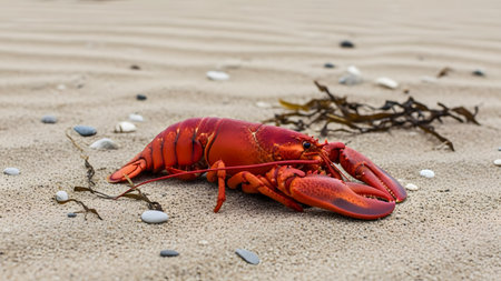 A whole cooked red lobster lies directly on the sandy grains of a beach shore. The contrast between the culinary delicacy and the raw natural seaside environment creates a striking visual.