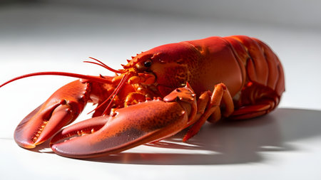 A whole cooked lobster displayed on a clean white surface, highlighting its vibrant red shell and large claws. The image conveys themes of gourmet seafood, luxury dining, and culinary ingredients.