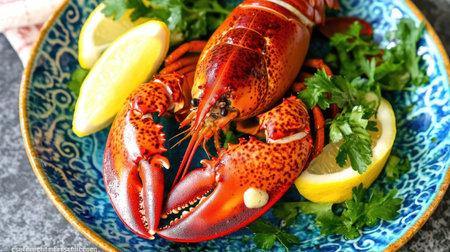 A close-up shot of a beautifully grilled lobster, known as , glazed with garlic butter and garnished with fresh herbs, served on a vibrant plate with lemon wedges.