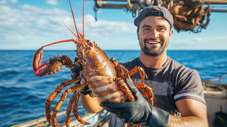 A smiling fisherman exhibits a large lobster in the foreground, with a clear blue ocean behind him. The image captures the essence of marine life and fishing culture.