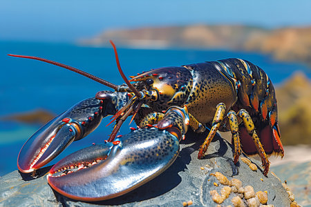A stunning close-up image of a lobster set against a rocky shoreline, showcasing its vibrant colors and detailed features. The ocean provides a serene backdrop, highlighting this marine creature's natural habitat.