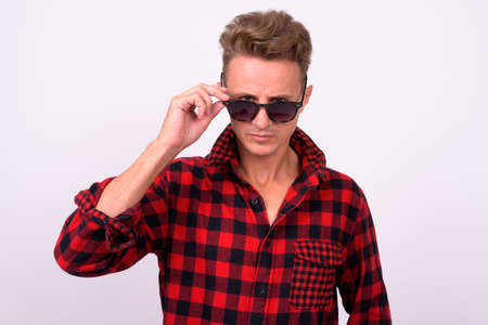 Closeup portrait of handsome thoughtful man posing on white studio background