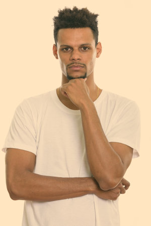 The young Asian man crossing one arm and putting another hand on the chin and looking forward thinking about future. Seen in white background. He has ambition and goal to complete and success.
