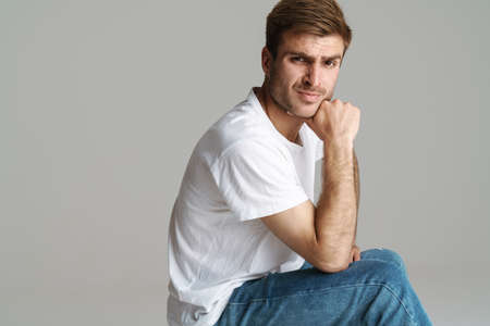 Portrait of redhead masculine man looking at camera while sitting on floor isolated over grey background