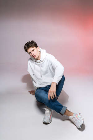 Pensive teen boy posing sitting on the floor in the studio. Portrait of stylishly dressed student. Studio shot Handsome attractive european man sitting on floor on a pink background.
