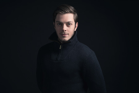 Young handsome man wearing fashionable clothes, looking at camera. A lot of copy space.