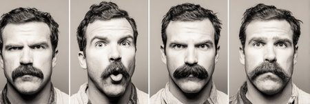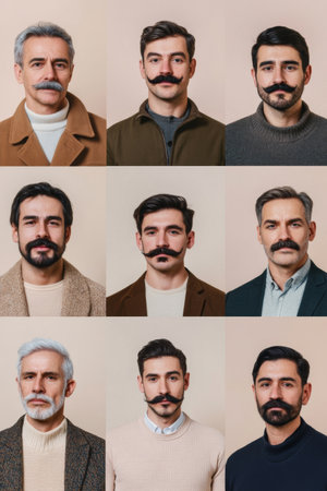 Collage of men with different mustaches posing against color backgrounds, AI Generated