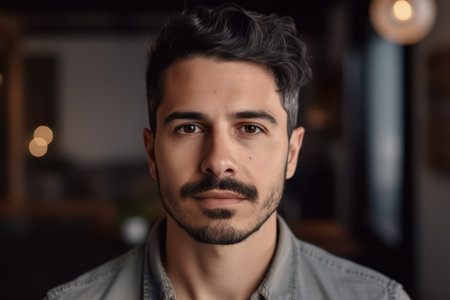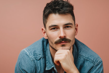 Casual man with short dark hair and mustache rests chin on hand wearing denim shirt, gazing forward with neutral expression and blurred warm-toned background