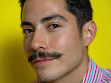 Smiling man with neatly groomed dark mustache and short hair wearing a colorful striped shirt. His eyes are warm and expressive, creating a friendly and approachable appearance