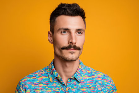 Young man with short dark hair and styled mustache, gazes forward wearing a brightly patterned shirt with abstract designs