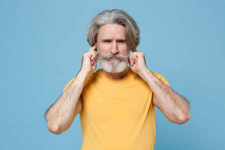 Concerned elderly gray-haired mustache bearded man in casual yellow t-shirt posing isolated on blue wall background in studio.