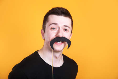 Funny young man holding a fake moustache in a stick in front of his face on yellow background