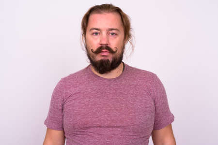 Bearded man with mustache and long hair against white background