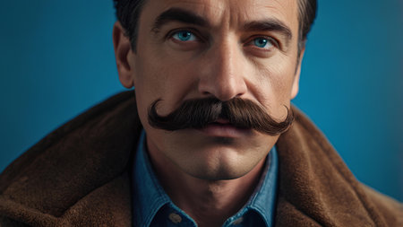 Portrait of a man with a mustache on a blue background.