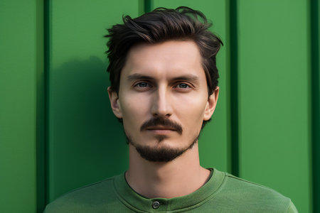 Illustration of young adult man with mustache on color background with copy space, AI Generated