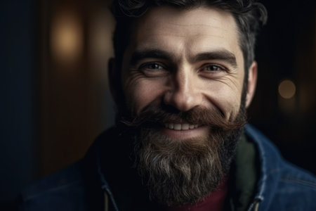 Close up portrait of handsome manly guy with beard and mustache looking in camera and happily smiling
