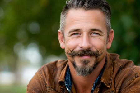 A close-up portrait of a mature man with a thick mustache and stylish gray beard, radiating confidence and sophistication against a soft, neutral background. Perfect for lifestyle themes.