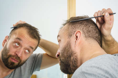 Adult man standing in front of the bathroom mirror brushing his short hair using comb. Guy investigating his receding hairline