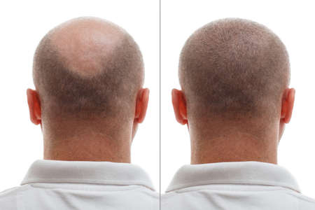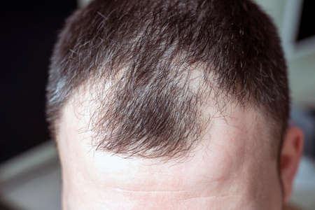 Close-up of a bald spot on a man's head. The medicine