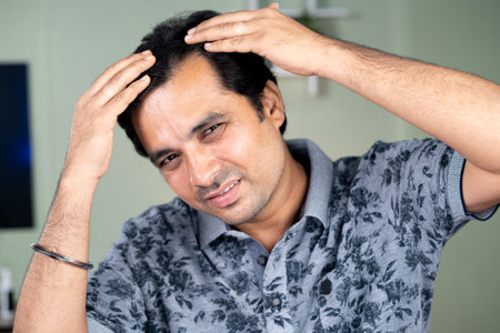 Worried Young man checking white hairs or Hair loss by looking Camera - concept of alopecia , Haircare and dandruff problem.