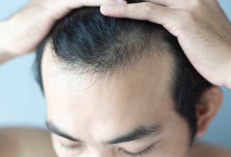 Young man serious hair loss problem for health care medical and shampoo product concept, selective focus