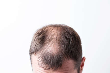 Close-up balding head of a young man on a white isolated background.