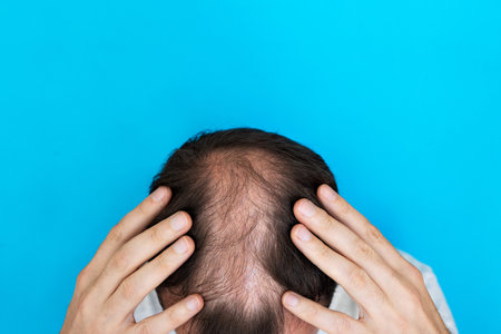 Close-up of a balding head of a young man on a blue isolated background.