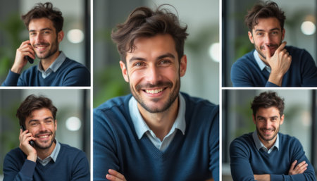 Diverse Group of Men Smiling and Engaging in Fun Activities Against Colorful Backgrounds