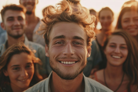 composition featuring a collection of people of various ages, genders, and races, all with beaming smiles. Captures the spirit of unity and happiness.