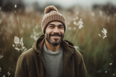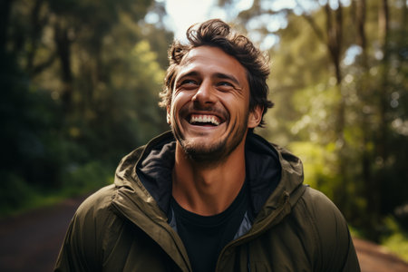 Smiling bearded man in a beanie enjoying the forest nature, contemplating life, seeking mindfulness, escape from the city, digital detox, and stress relief