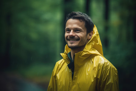 Portrait of happy man in raincoat standing in rainy forest.