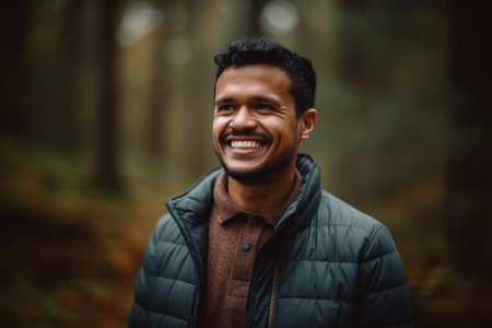 Portrait of a happy young indian man smiling in the forest