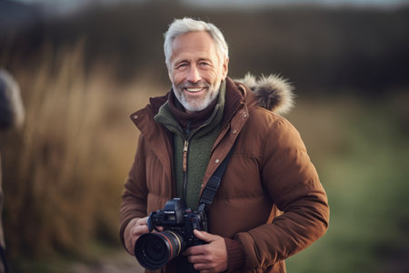 Portrait of senior man with camera in autumn nature. Man is looking at camera and smiling.