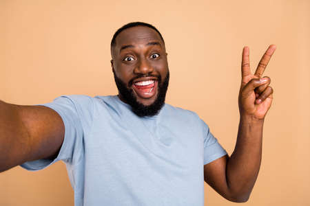 Self-portrait of attractive cheerful childish guy showing v-sign good mood isolated over beige pastel color background