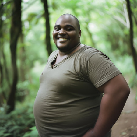 portrait of a young smiling thirty-year-old obese man against the backdrop of the jungle.