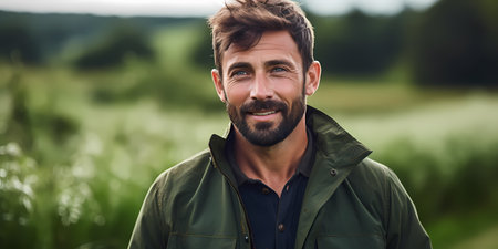 Portrait of a handsome young man with a beard in a green jacket in the field